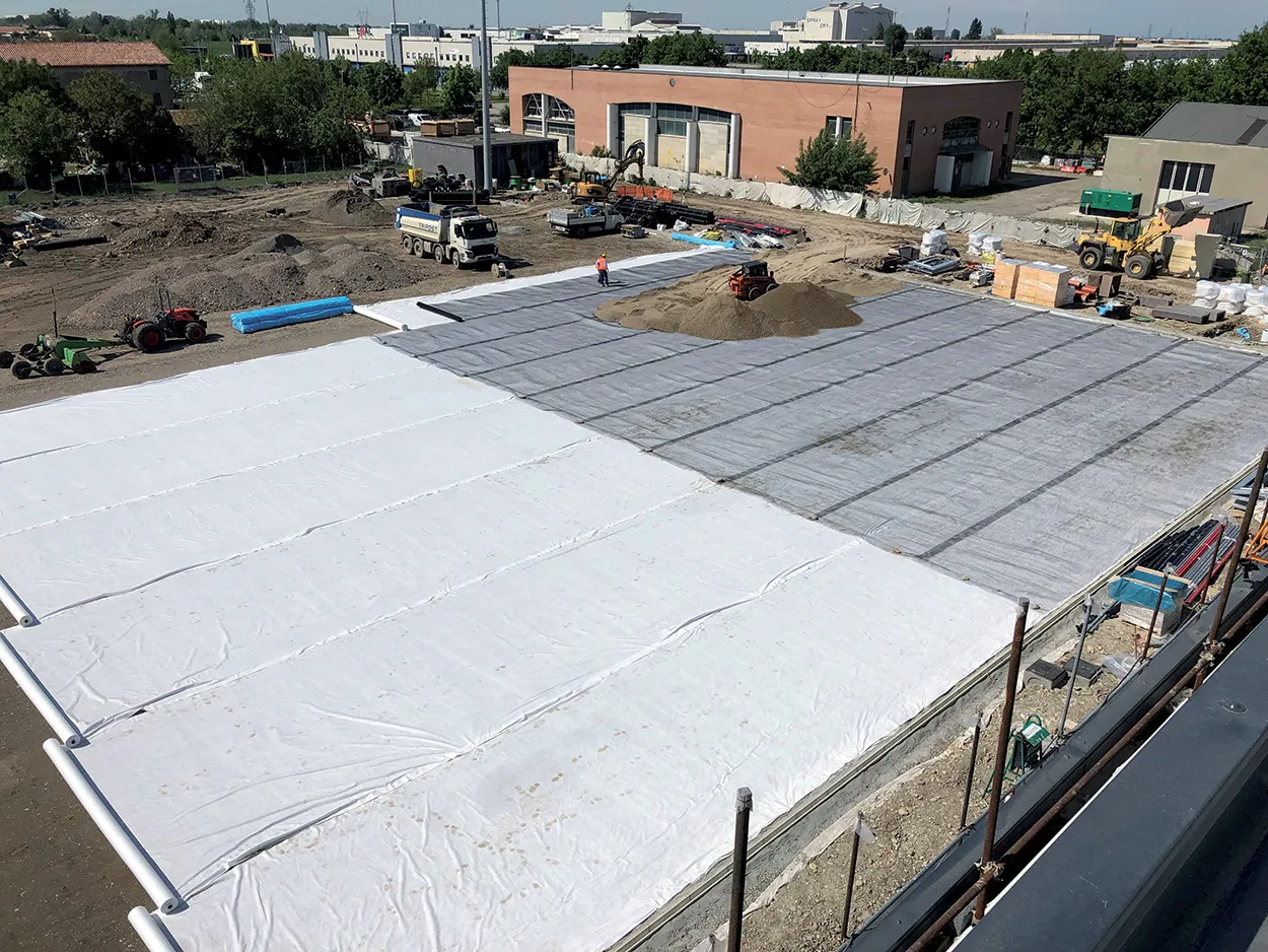 La grande innovazione della stratigrafia adottata per il campo è rappresentata dalla possibilità di evitare per un’area ex-novo l’ingente scavo di sbancamento di oltre 3.500 m3, altrimenti necessario per la realizzazione di un drenaggio tradizionale di tipo verticale, con l’apporto di inerti vergini ed il posizionamento della rete di tubazioni di drenaggio. Da segnalare che la soluzione tradizionale con drenaggio verticale avrebbe comportato il transito all’interno del contesto urbano della città di Sassuolo di oltre 400 automezzi adibiti allo smaltimento del materiale di scotico ed all’approvvigionamento del nuovo materiale di cava per la realizzazione degli strati drenanti.