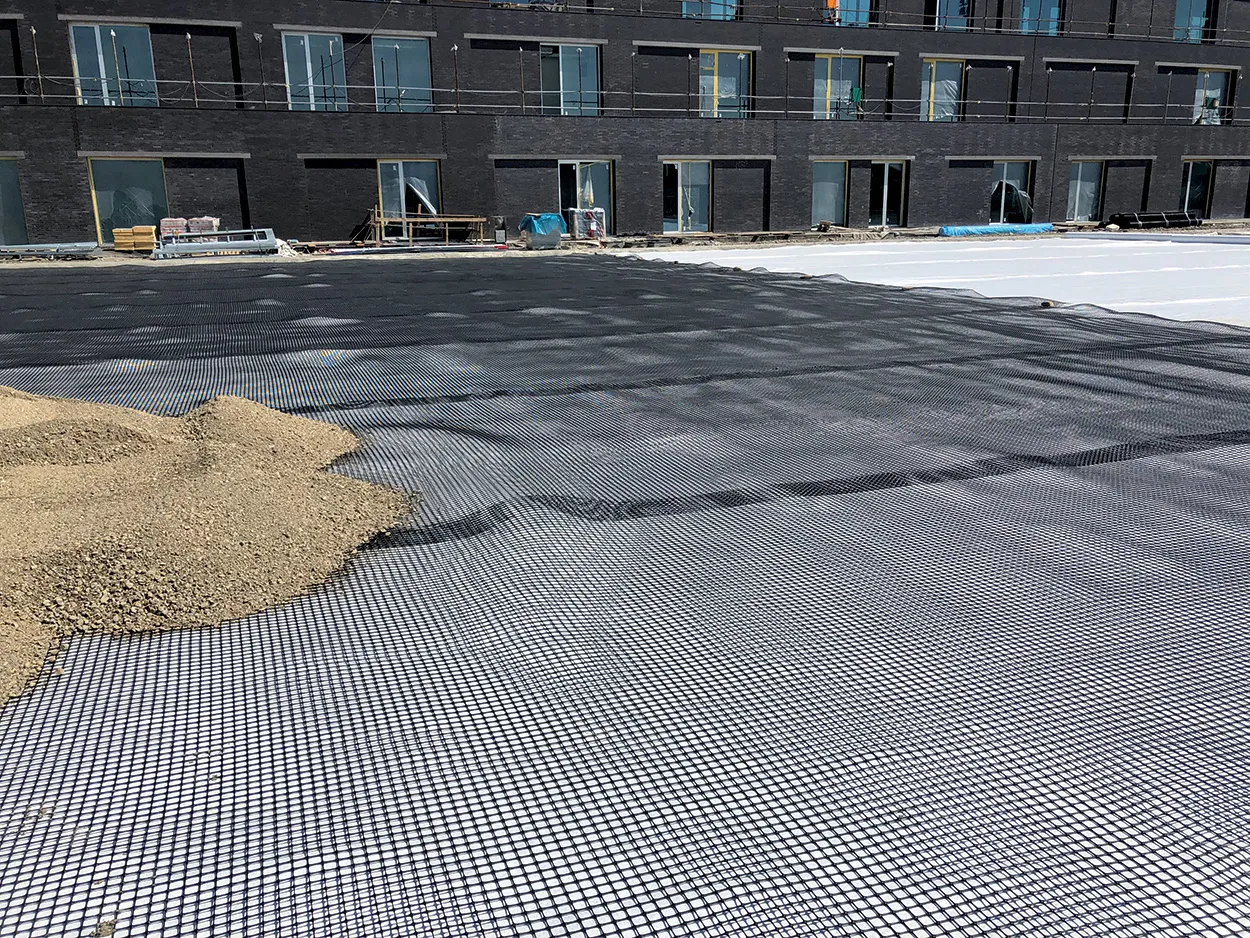 L’intervento di realizzazione del drenaggio del campo ha richiesto pertanto una preliminare fase di scotico con contestuale allontanamento dall’area della matrice organica del terreno esistente e successiva sagomatura tramite baulatura. Alla base dell’area predisposta è stato quindi installato un geotessile non tessuto in combinazione con apposito elemento di rinforzo sintetico a struttura piana, ovvero una geogriglia biassiale estrusa in polipropilene, che grazie alla resistenza a trazione e l’interazione con il terreno consente un incremento della capacità portante dell’area e soprattutto un miglioramento nella distribuzione dei carichi. Inoltre, la combinazione di geotessile non tessuto e geogriglia biassiale costituisce un geocomposito che unisce alla peculiarità di rinforzo anche la funzione di filtro-separazione propria dei non tessuti.