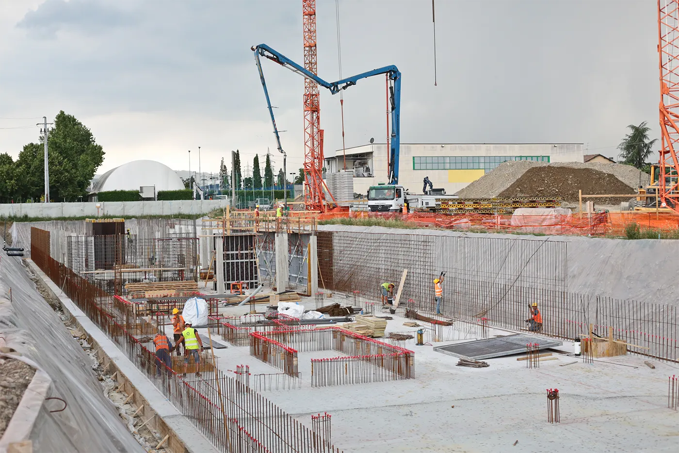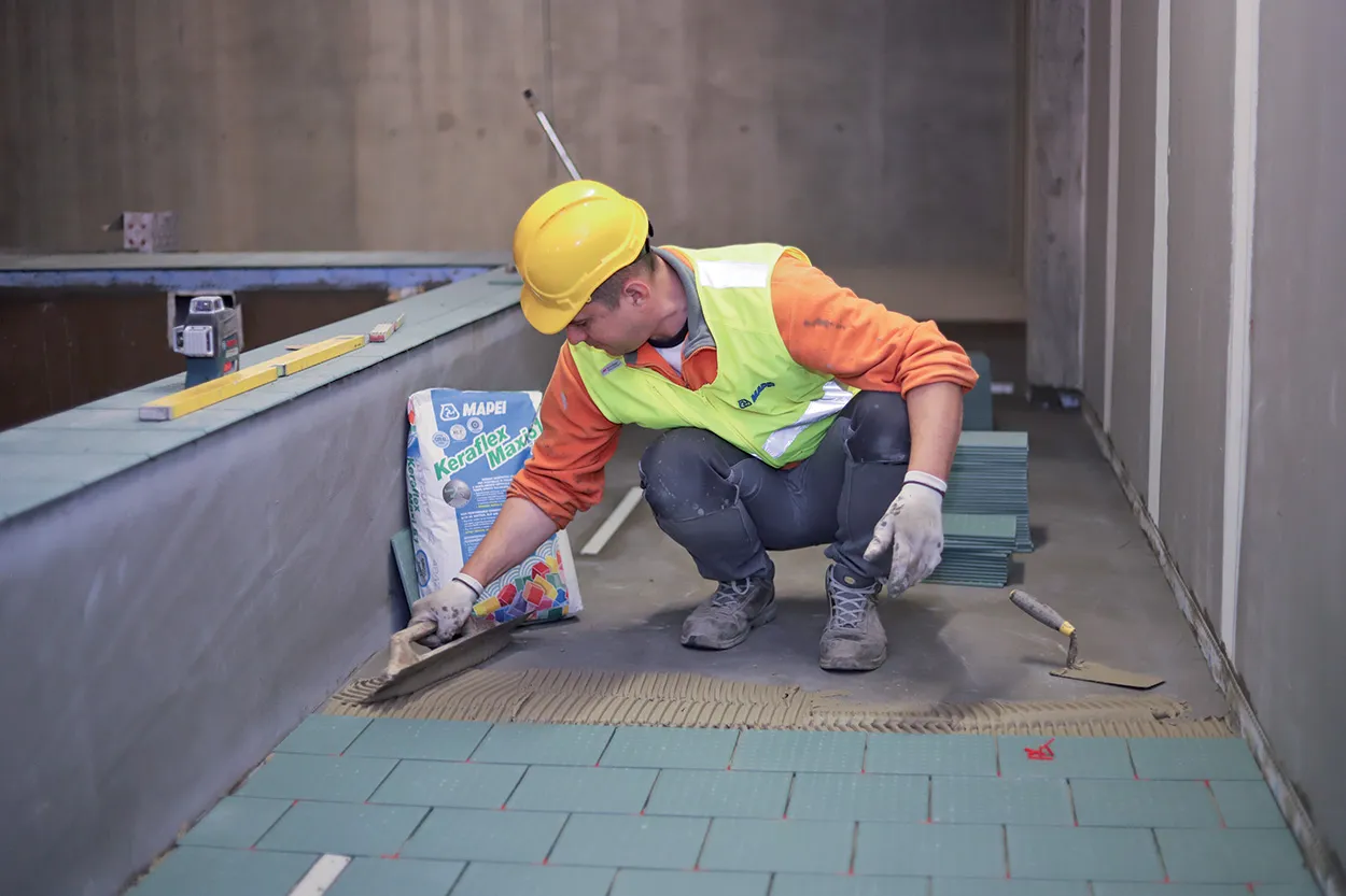 Le linee MAPEFLOOR System ed ULTRATOP System, sono invece state utilizzate per le finiture degli spazi interni al centro sportivo, in abbinamento a sottofondi TOPCEM. Non potevano mancare la posa e la stuccatura dei rivestimenti ceramici con KERAFLEX MAXI S1 e KERAPOXY e le operazioni di impermeabilizzazione nei bagni con la malta cementizia bicomponente MAPELASTIC.