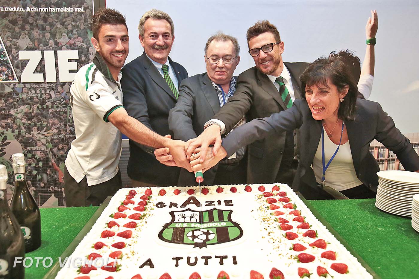 Con un turno di anticipo, il Sassuolo è salvo! Dopo la vittoria per 4-2 contro il Genoa l’11 maggio 2014, arrivata negli ultimi minuti con i gol di Sansone e Floro Flores, può esplodere la gioia dei tifosi neroverdi che festeggiano un’incredibile impresa sportiva.