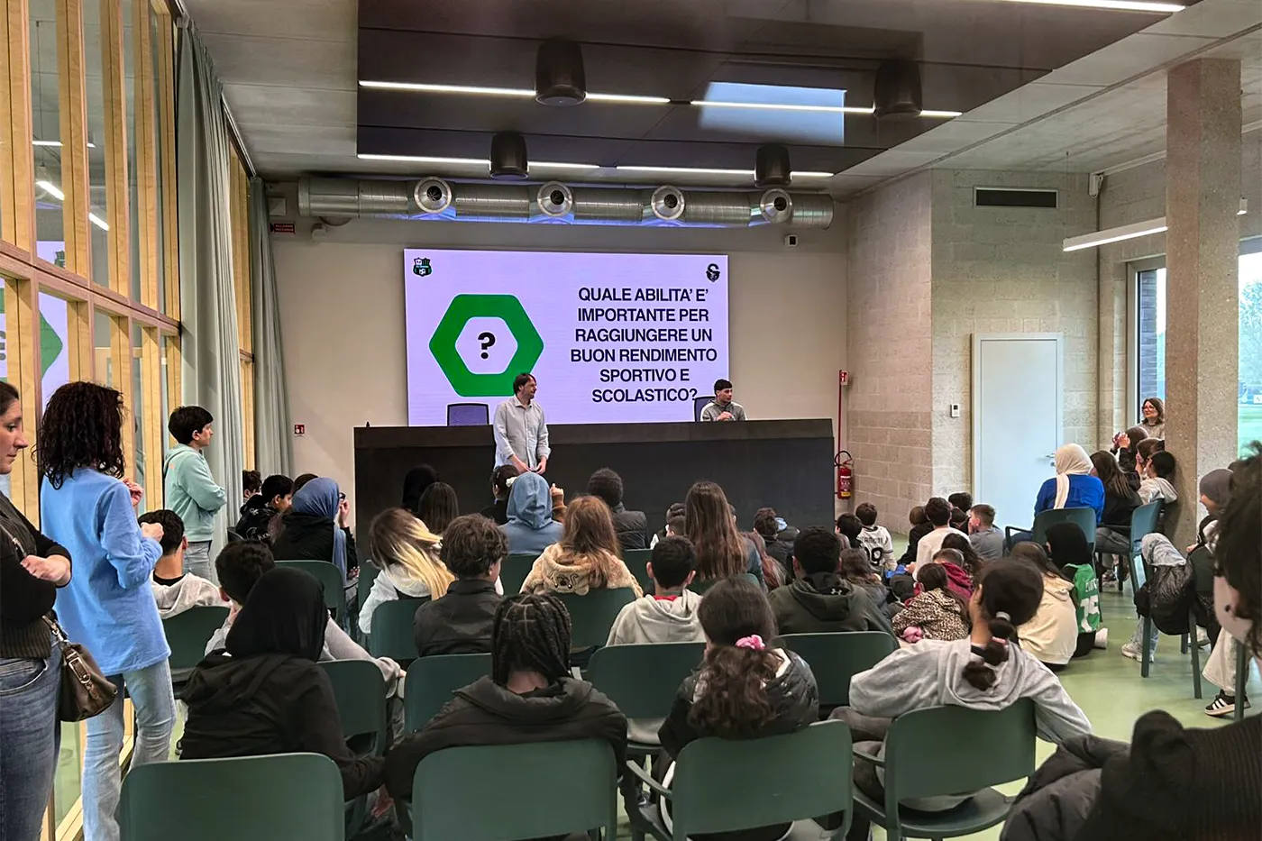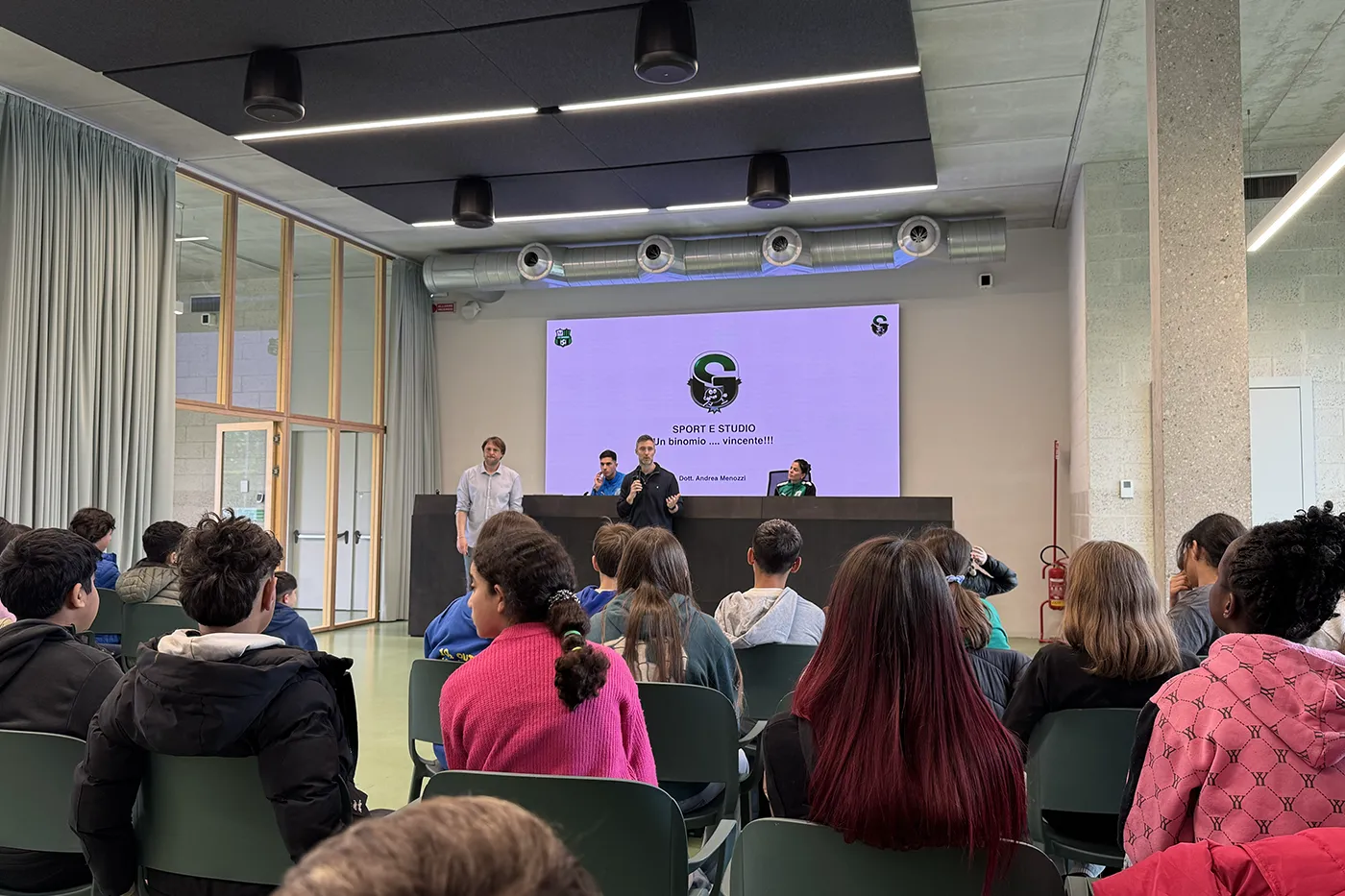 Protagonisti dell’incontro sono stati i calciatori Cristian Volpato e Aurora De Rita, delle Prime Squadre, insieme a Giacomo Seminari della Primavera neroverde, che hanno dialogato con circa 150 alunne e alunni delle Scuole Secondarie di Primo Grado Parco Ducale e Cavedoni di Sassuolo.