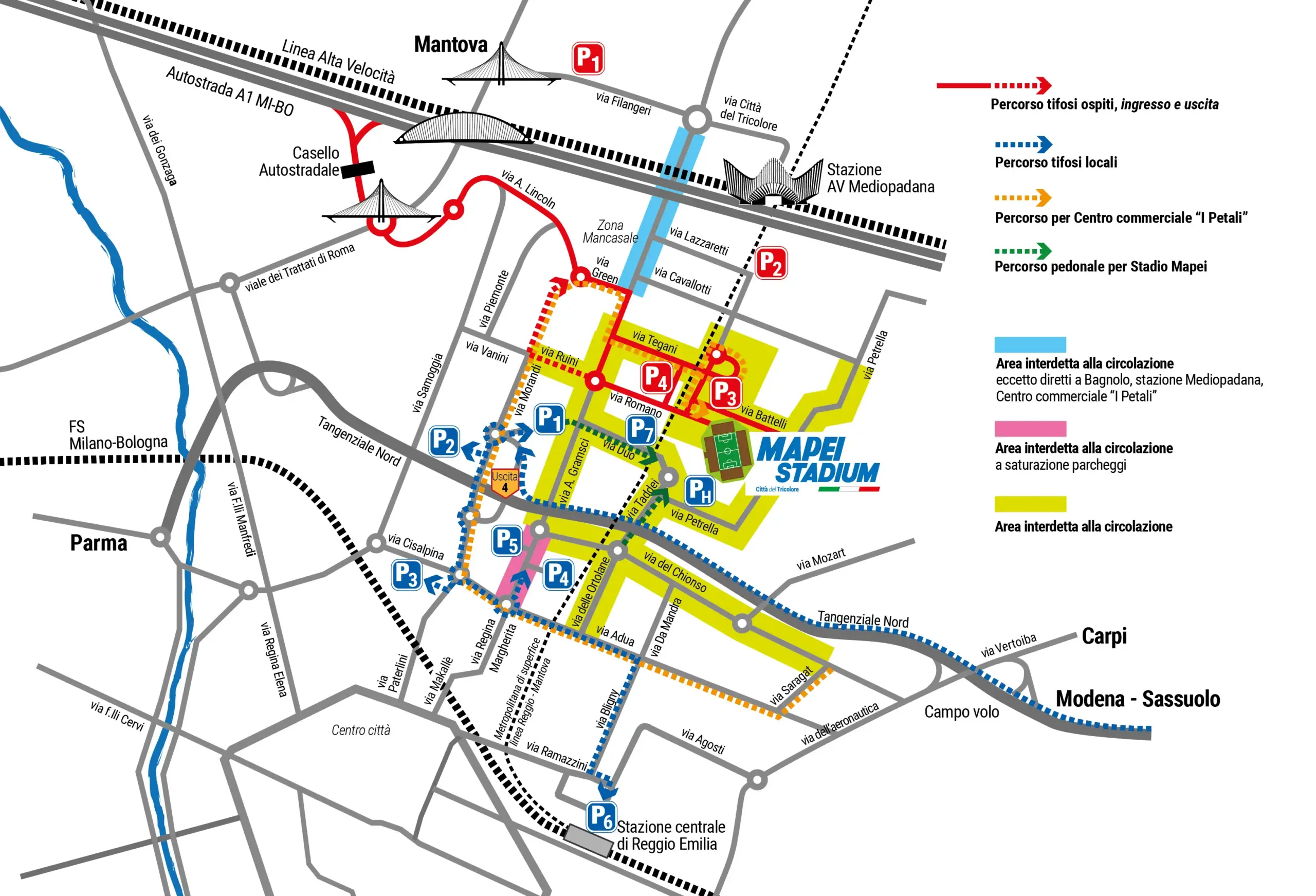 - P3 – Parcheggio I Petali (adiacente allo stadio) riservato agli ospiti in Tribuna Est